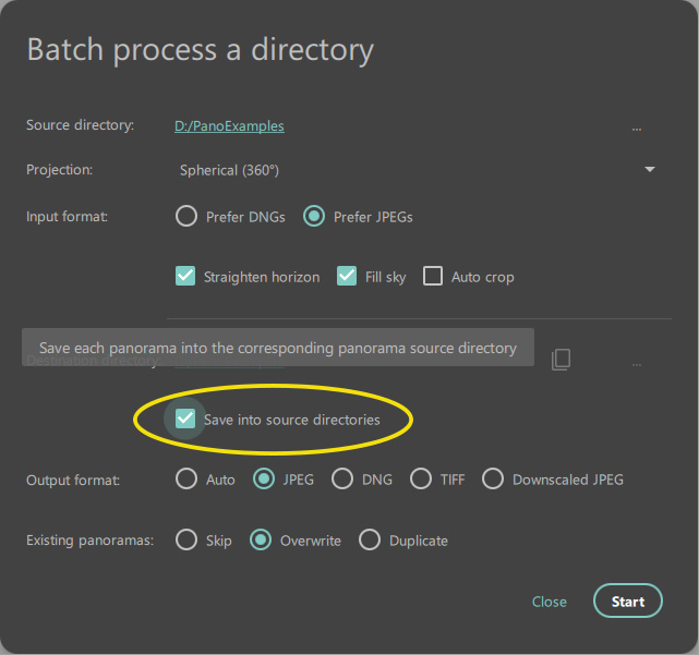 • Replaced the “Use source directory” option with “Save into source directories” in Batch mode. When enabled, panoramas are saved to their corresponding source directories. To replicate the previous behavior – saving panoramas to the parent folder – copy the source directory path to the destination directory using the dedicated button.